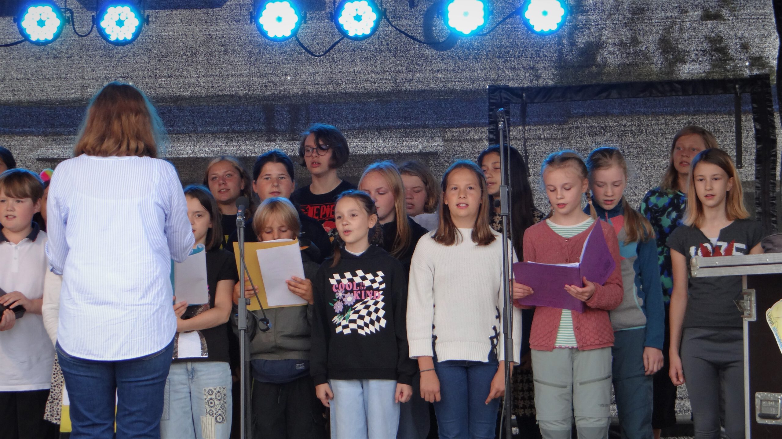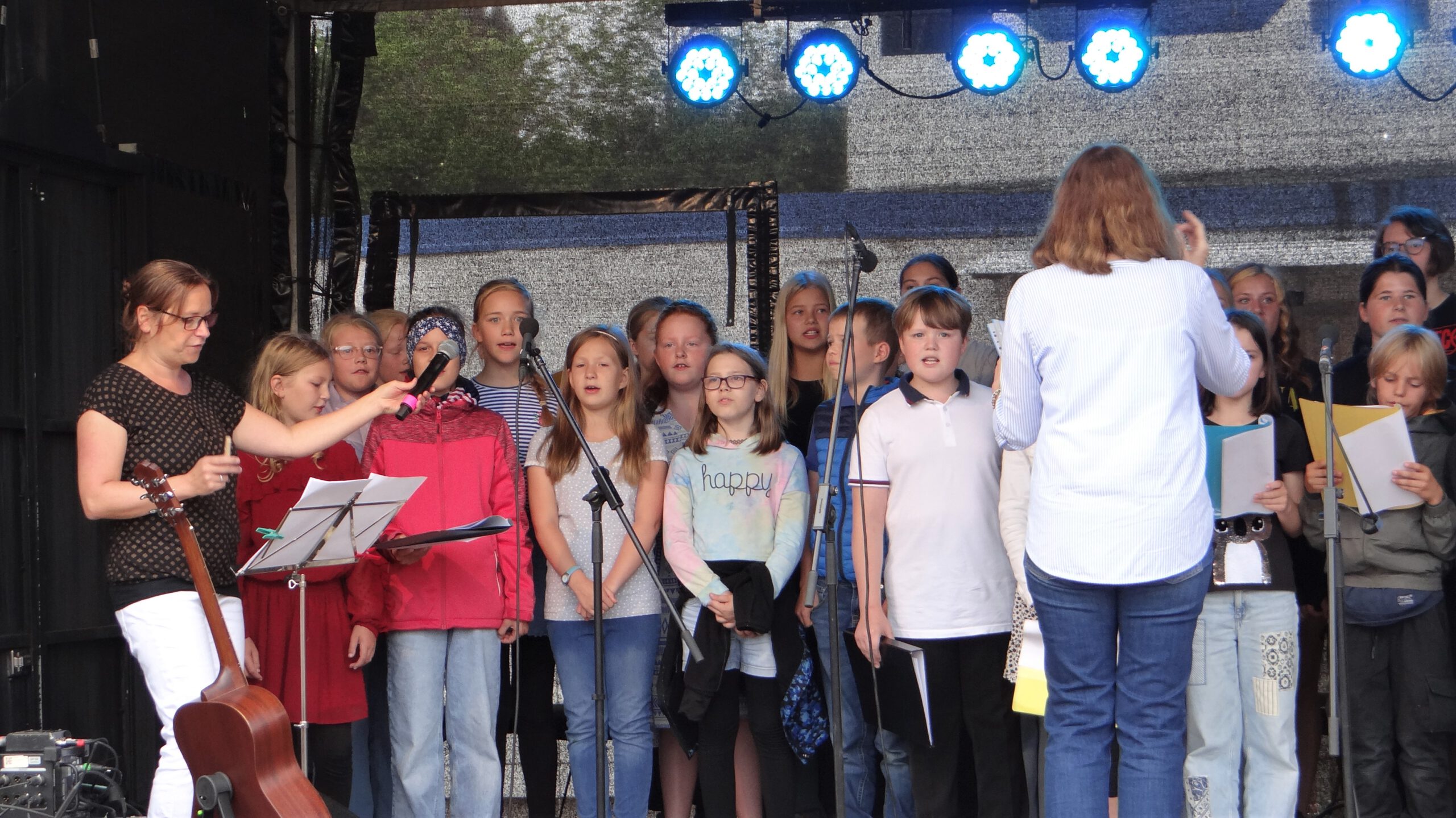 Die Schüler unseres Kinderchors und der Klasse 6c präsentierten unter der Leitung von Sigrid Palm und Ines Banaszkiewicz ein schwungvolles Bühnenprogramm. Neben Liedern wie „Globus“ von Namika, „Hoch“ von Tim Bendzko und „Wer, wenn nicht wir“ von Wincent Weiss erklangen auch „Irgendwas bleibt“ von Silbermond und „Besser gehts nicht“ von 2raumwohnung.