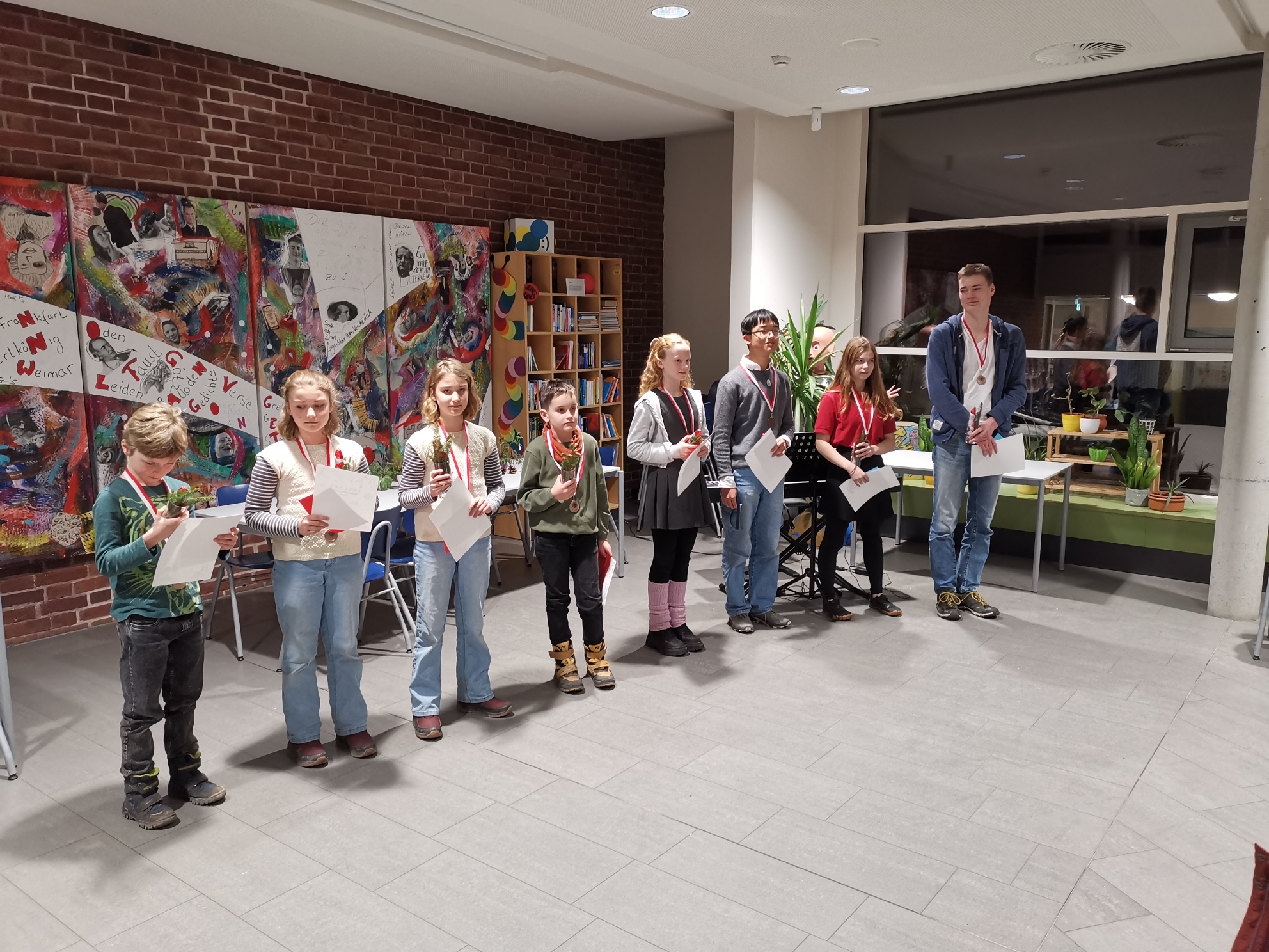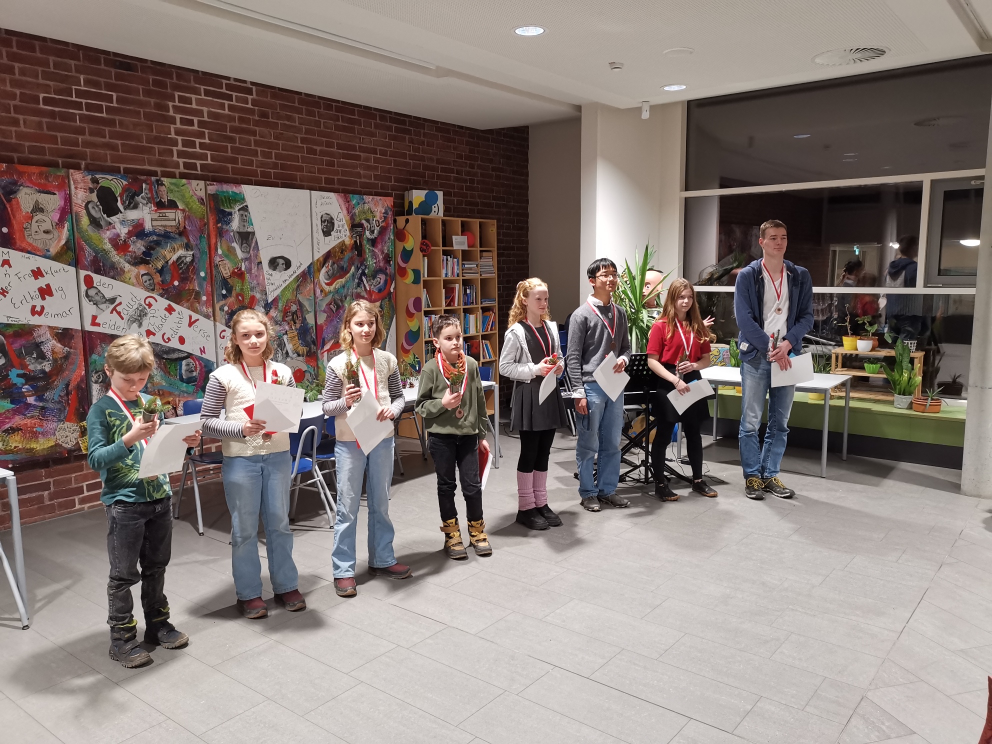 Nachdem alle Arbeiten ausgewertet wurden, standen die Sieger fest. Die Aufregung stand ihnen ins Gesicht geschrieben und mit Stolz und Freude wurden die Preise entgegengenommen. Zusammen mit den Eltern wurden die Preisträger gefeiert.
