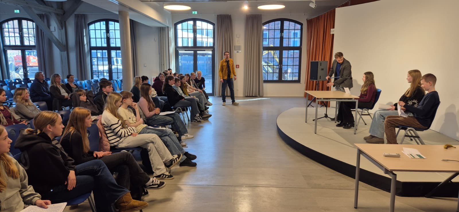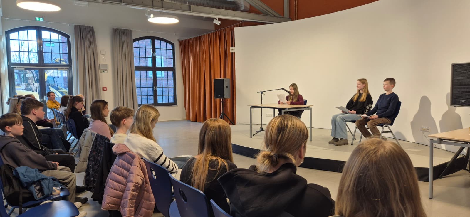 Am 12. März fand am Schulzentrum am Sund der erste „Tag der Worte“ statt. Achtunddreißig Freiwillige aus den siebten, achten und neunten Klassen verteilten sich auf drei Workshops und präsentierten im Frankenkronwerk ihre frisch verfassten und eingeübten Theaterszenen, Geschichten und Gedichte. Es gab Tränen der Rührung und Gelächter untermalt von Sonnenschein. Dem voran ging die Erarbeitung der Werke in lebendiger (Drama), konzentrierter (Epik) und einfühlsamer (Lyrik) Atmosphäre. Die fröhlichen Gesichter der Teilnehmer sprachen sich deutlich für eine Wiederholung aus.