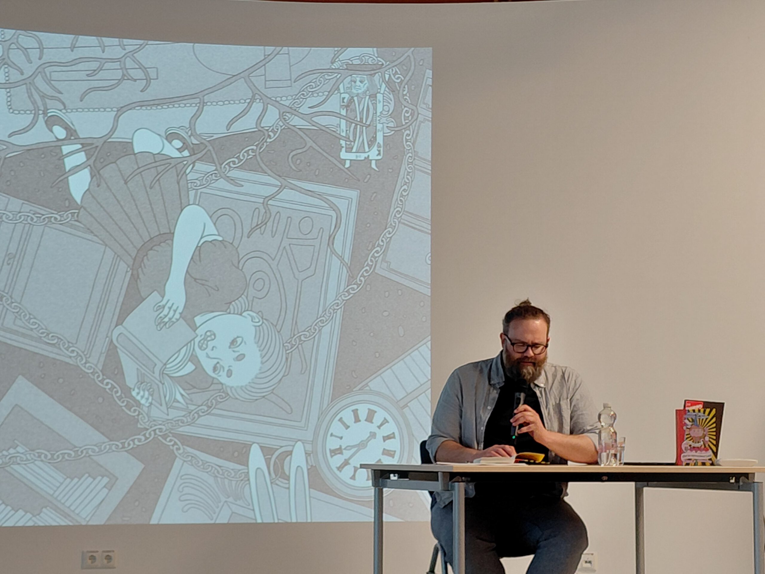 Anschließend gab er uns einen Einblick in sein Buch, indem er einige Textstellen vorlas, diese erklärte und auch die Illustrationen zeigte. Am Ende gab es die Möglichkeit, Fragen zu stellen oder Kommentare abzugeben.